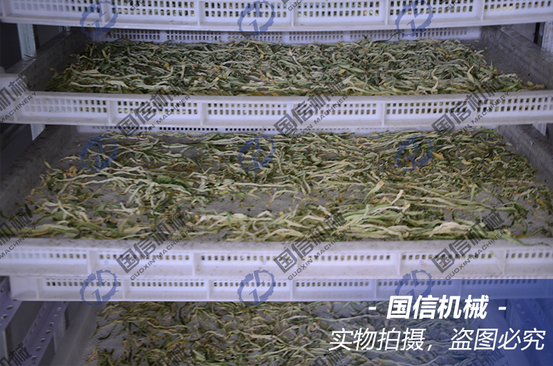 當蔬菜水分蒸發率達到50-60%左右時,游離水很大程度的減少,這個時候蔬菜內部水分擴散速度減慢,此其表面的水分汽化還慢,這個階段稱蔬菜的減速階段,隨著水分的進一步蒸發,烘干室的溫度也逐漸升高,使水含量達到一個平衡含水率,物料水分含水量在15%左右,烘干時間為8-15 個小時,干燥完成,這時達到烘干的優質效果。