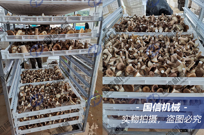香菇烘干工藝對裝盤的要求嚴格。裝盤時,需將菌蓋朝上,菌柄朝下,均勻擺放,不能重疊或者堆積,防止對香菇造成損壞,從而影響質量。建議采摘后的6個小時內必須送入烘干房,如有剩余,則需放入冷庫進行冷藏。