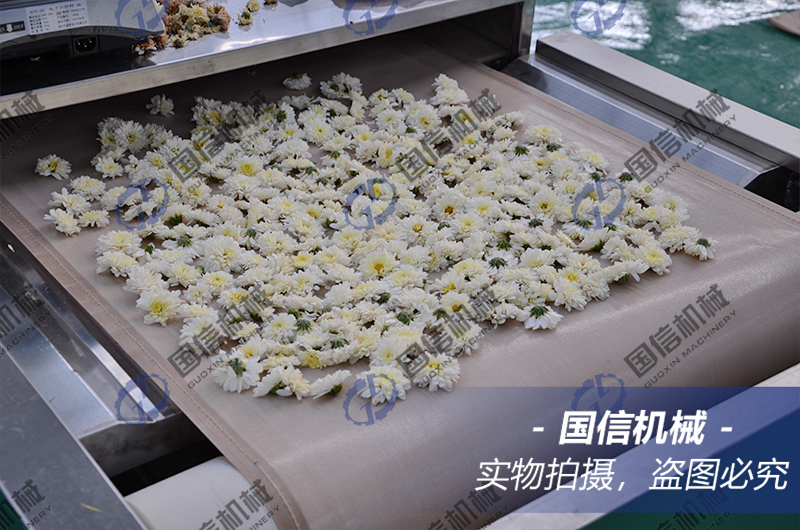 顧名思義,這款設備采用的就是微波來進行烘干和殺青,設備集殺青、殺菌、烘干于一體,一機多用,工作原理是以微波的高頻震蕩作用,使菊花從內而外的干燥,殺青效果好,營養物質保留完整,烘干后的菊花色澤鮮艷,不變色,賣相好。