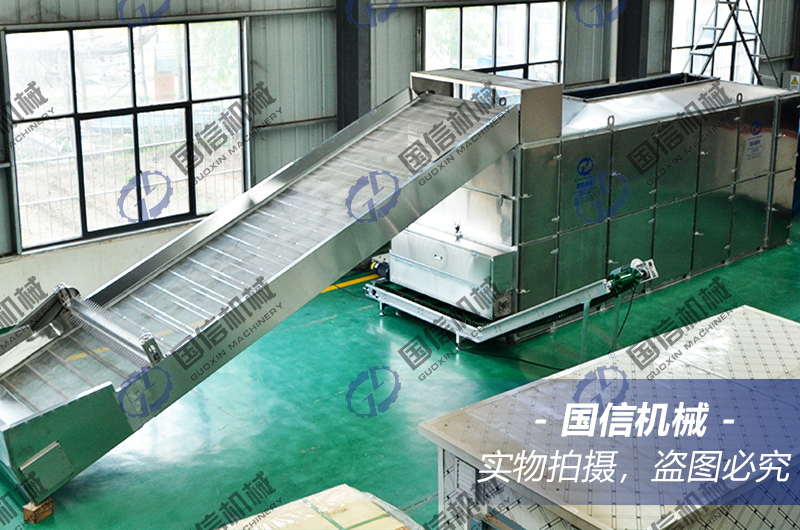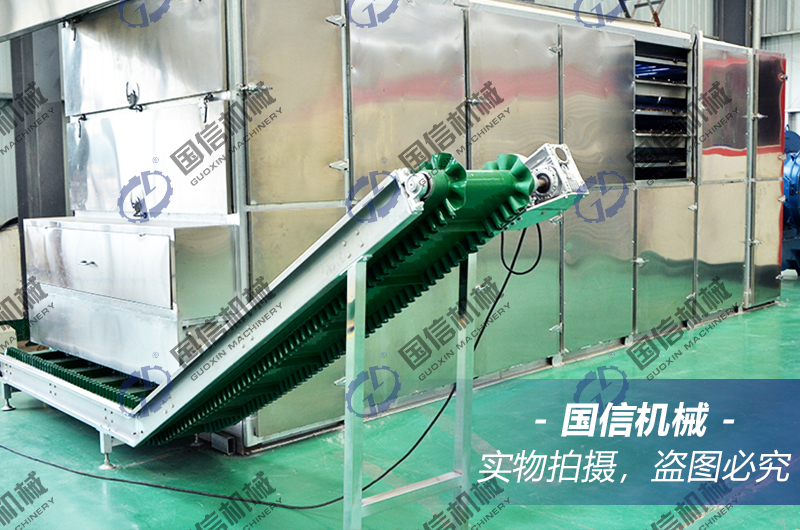 另外一種全自動化加工模式的網帶式食用菌烘干機設備,主要是針對產量非常大的客戶推出的,每天的建議加工量為六千斤至萬斤以上。干制加工時,只需將清洗挑揀處理好的菌菇放入上料輸送機即可,在設備內部采用的是多層網帶結構,通過智能化的控制系統能夠讓菌菇自動上料,進入烘干主機,然后在主機內部緩慢勻速移動,在主機內部會經過4~6次的翻層轉換,逐步向出料口移動,與此同時,熱風會從烘干機底部向上穿過載有食用菌的網帶層,對菌菇進行干制,并帶走其中的水分,從而實現逐層干制菌的目的。