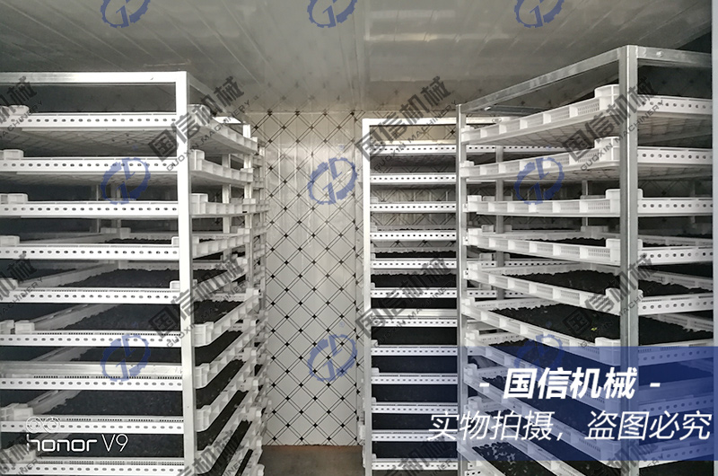 桑葚是高糖分、高水分含量的漿果,較長果形是由一個一個小果囊的形狀組成,水分難以出來,所以需要較長的時間。同時烘干溫度又不能太高,溫度太高,就容易影響花青素的有效含量。烘干第一階段溫升一小時,不排濕,烘干模式,讓烘干房上升至50度左右。第二階段設為烘干+排濕模式,目標濕度為60%,目標溫度設為55度。第三、第四階段每一階段上升5度,目標濕度下降10%,讓烘干房不斷排濕。最終一個階段目標濕度設為15%左右。如果條件許可,可以考慮在第四階段末了,停機靜置一段時間再復烘,這樣果干內部的水份滲出后被復烘的熱量加熱揮發,果干果形更好,同時總體能效更好。