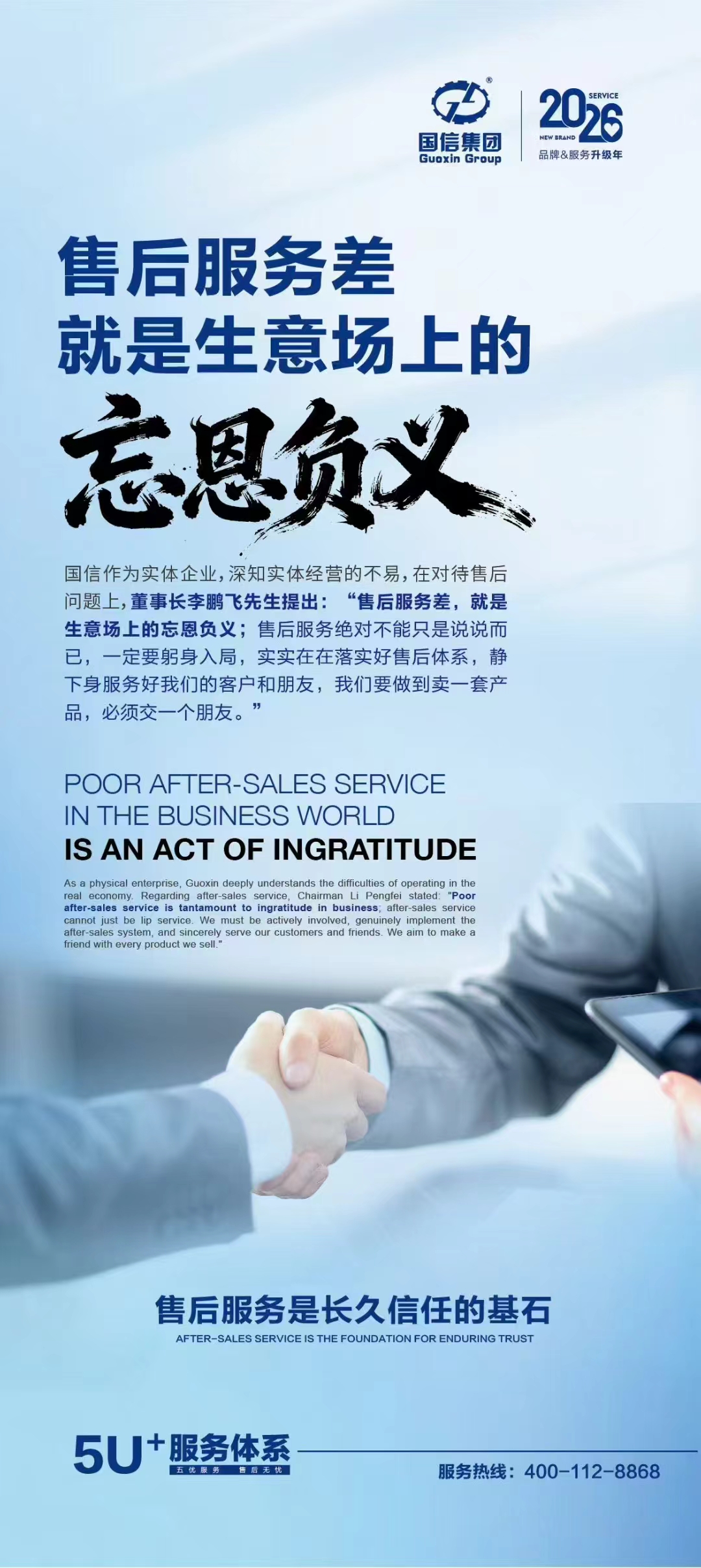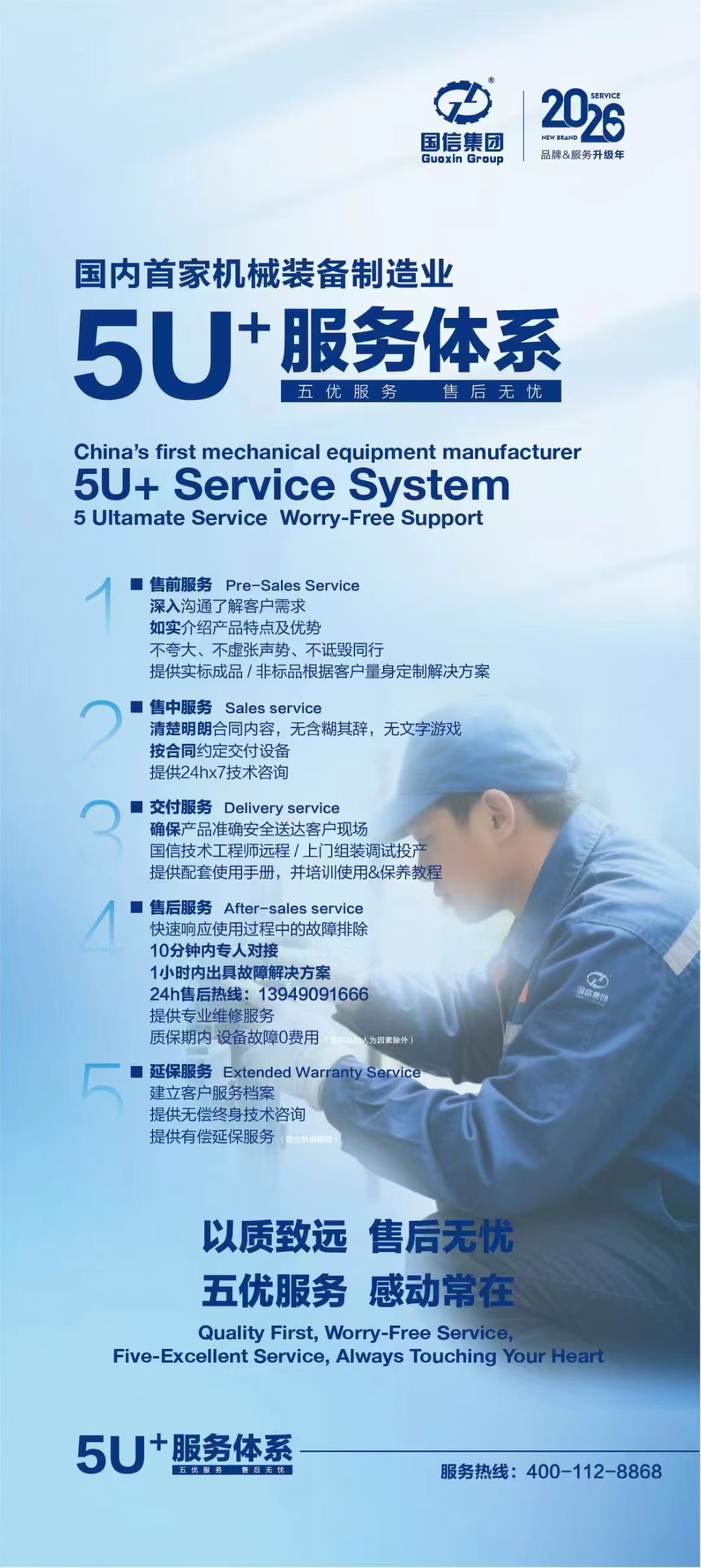 在機械裝備制造業(yè)深耕十五年之際,國信集團于2025年11月27日正式提出全新的5U+服務(wù)理念,以“五優(yōu)服務(wù),售后無憂”為核心承諾,致力于為全球客商打造一個覆蓋售前、售中、售后的全閉環(huán)、全維度服務(wù)體驗。這一理念的提出,標(biāo)志著國信集團在持續(xù)提升產(chǎn)品力的同時,全面邁向“以客戶體驗為中心”的服務(wù)新階段。
