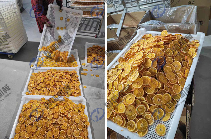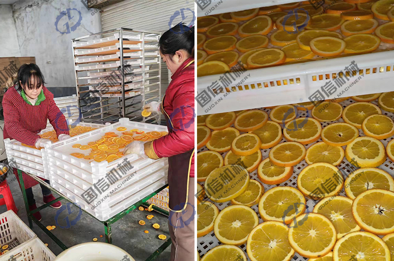 首先把橙子進行清洗切片,均勻的擺放在托盤上,放入烘干房內即可;烘干階段,設定橙子烘干所需的溫度濕度等參數,一般溫度在45-60度之間,時間大約5小時以上,按照你所需要的軟硬程度,設定具體的控制時間即可。使用這種橙子烘干工藝,對橙子進行烘干,可以很好的保證橙子干自身的口感,也解決了橙子產量過剩的問題,有效的增加了橙子自身的經濟價值,這也是我們國信機械廠家眾多水果烘干加工的一種,其實我們在為客戶提供烘干設備的同時,也會對物料干制加工進行整體的烘干解決方案提供,通過近二十年的發展,我們積累了大量的水果烘干加工經驗,如果你有相關需求,可與我們聯系,進行相關的經驗交流。