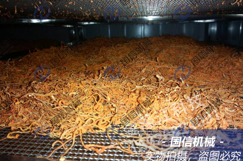 蟲草花烘干機工藝:初步排水階段:由于剛培育出來的蟲草花含水分含量達到87%以上,因此,前期需要用35℃左右的溫度,來烘烤3~4小時,先初步的排出一部分水分;